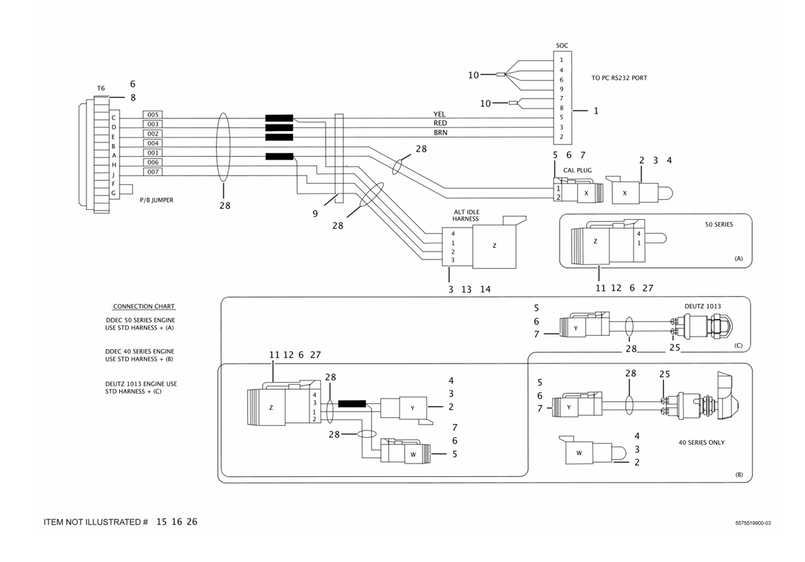 項(xiàng)目零件號(hào)名稱(chēng)數(shù)量備注再制造件號(hào)L COMPLETE _ASSEMBLY 5575519900 CALIBRATION SET 1 TRANS. DIAGNOSTIC HARNESS 1 5541065500 CABLE 1 6FT D-9M TO D-9FM 2 5541027400 RECEP CONNECTOR 3 CAVITY-2,SIZE 16,MALE,PLASTIC,CABLE MOUNT, DT04-2P (DEUTSCH) 3 5540455500 CONTACT, PIN 10 PIN SIZE 16. AWG 16-18 4 5541027500 CONNECTOR LOCK 3 CONN. LOCK 2-PINDT SERIES 5 5541027200 PLUG CONNECTOR 4 CONN. PLUG 2-SOCKET DT SERIES 6 5540119300 SOCKET 22 SOCKET SIZE 16, AWG 16-18 7 5541027300 CONNECTOR LOCK 4 CONN. LOCK 2-SOCKETDT SERIES 8 5541057200 PLUG 1 PLUG 9 WAY 9 5580001221 HEAT SHRINK.BO. 0.08 W/ADHESIVE 10 5580001220 HEAT SHRINK.BO. 0.16 W/ADHESIVE 11 5541035000 PLUG CONNECTOR 2 MALE, PLASTIC, CABLE MOUNT 12 5541034500 LOCK 2 SECONDARY LOCK-4 POS SOCKET 13 5541034700 CONNECTOR 1 CONN-RECEPT-4 POS-PIN TYPE 14 5541035400 CONNECTOR LOCK 1 SECONDARY LOCK-4 POS-PIN TYPE 15 5537302100 SWITCH 1 PUSH BUTTON 16 3217001011 CONTROL SWITCH 1 2 POSITION/STAY PUT 16 3217000502 CONTACT BLOCK 1 1 SL 1 BR P B 25 5540661600 CABLE LUG 4 TERM-RING 26 5580000051 CABLE 6.30 WIRE-WHT16 27 5534825400 SEALING PLUG 3 SIZE 14-16, AWG 12-16 28 5580001100 SPIRAL HOSE 1.40 SPIRAL WRAP