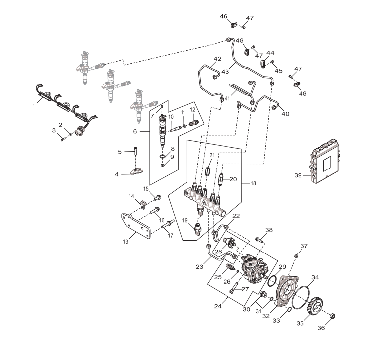 Item Part Description Quantity Variation Number 16GX 1 GM88748 Wiring Harness 1 2 # Washer, 5.300 X 10 X 1 mm 2 3 # Cap Screw, M5 X 20 2 4 GM49839 Clamp 4 5 GM46623 Cap Screw 4 6 GM88739 Nozzle Kit 4 7 GM46621 Nut 8 8 GM46635 O-Ring 4 9 GM46638 Washer 4 10 GM49996 Tube (order O-Ring also) 4 11 GM46631 O-Ring 4 12 GM46633 Nut (order O-Ring also) 4 13 GM52524 Bracket 1 14 GM50293 Clamp 1 15 # Screw, M10 X 25 2 16 # Screw, M10 X 45 1 17 GM88690 Stud 1 18 GM52523 Rail 1 19 GM49988 Sensor 1 20 GM46637 Restrictor 4 21 GM49936 Press. Relief Vlv (incls shim) 1 21 GM49835 Shim 1 22 GM88736 Fuel Line 1 23 GM88737 Fuel Line 1 24 GM50052 Fuel Injection Pump 1 Item Part Description Quantity Variation Number 16GX 25 GM46641 Sensor, Fuel Temp 1 26 GM79805 O-Ring 1 27 GM46642 Screen 1 28 GM77158 Control Valve 1 29 GM46643 O-Ring 1 30 360078 Plug, Drain 1 31 360180 O-Ring, 17.3 X 2.2 mm 1 32 GM46647 Adapter 1 33 GM46646 O-Ring 1 34 GM46644 O-Ring 1 35 GM46645 Gear 1 36 224161 Nut 1 37 # Flange Nut, M8 3 38 # Screw, M8 X 30 2 39 GM88728 Electronic Control Unit 1 40 GM88744 Fuel Line 1 41 GM88745 Fuel Line 1 42 GM88746 Fuel Line 1 43 GM88747 Fuel Line 1 44 224071 Clamp 1 45 # Cap Screw, M6 X 12 1 46 223572 Clamp 3 47 # Cap Screw, M6 X 12 3