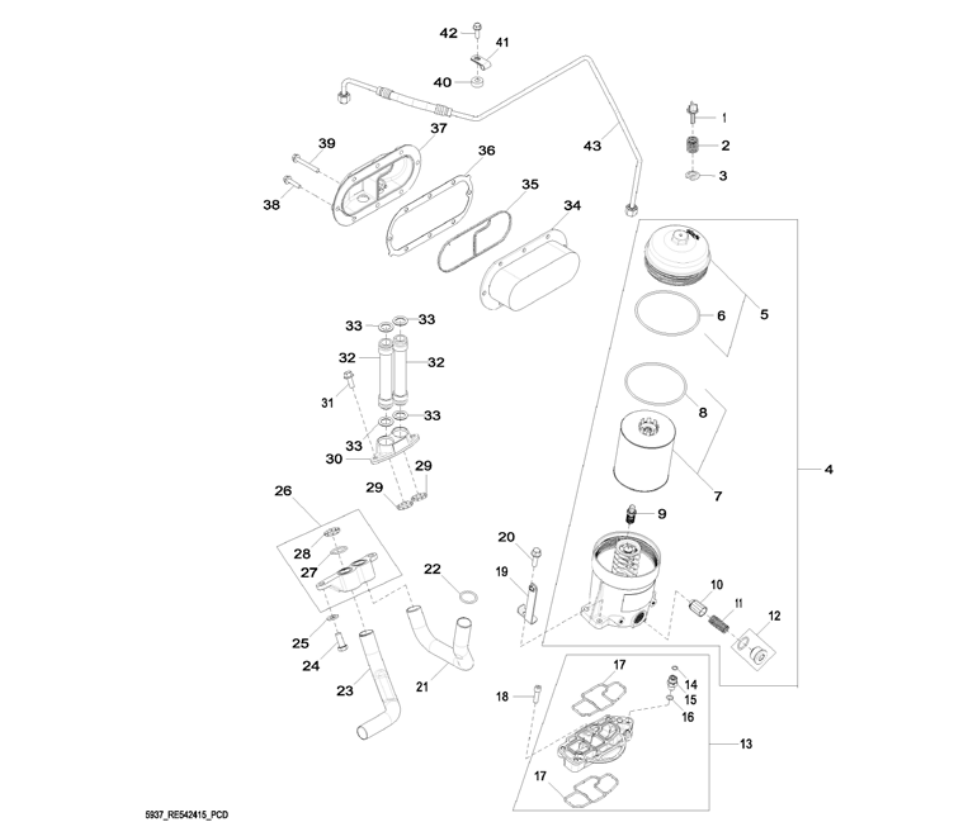 Item Part Description Quantity Variation Number 5937 1 352722 VALVE (was R108867) 1 2 352811 SPRING, BYPASS 1 3 GM50130 Retainer 1 4 GM50200 Filter assembly (Replaces RE505743) 1 5 GM52862 Cap 1 6 GM67282 O-ring 1 7 GM48731 Element, oil filter 1 8 GM67282 O-ring 1 9 GM67292 Drain valve 1 10 GM52863 Pressure relief valve 1 11 GM52864 Compression spring 1 12 GM52865 Fitting plug 1 13 GM50219 Fitting, adapter 1 14 360555 O-RING 1 15 GM67272 Adapter fitting 1 16 223742 O-RING 1 17 GM50207 Seal kit 2 18 GM67279 Cap screw 3 19 GM98737 Bracket 1 20 M933-10035-82 SCREW, HEX CAP M10 x 35mm 4 21 GM50146 Oil tube 1 Item Part Description Quantity Variation Number 5937 22 223850 O-RING 1 23 GM67285 Oil tube 1 24 # Cap Screw 2 25 # Washer, M12 X 30 2 26 GM50247 Fitting, Adapter 1 27 223850 O-RING 2 28 GM50129 Seal 2 29 GM50129 Seal 2 30 GM50145 Fitting, Adapter 1 31 # Screw, M10 X 25 2 32 GM50206 Oil tube 2 33 GM50149 O-ring (Replaces R518804) 4 34 223680 OIL COOLER 1 35 GM88067 Seal (Replaces R504668) 1 36 GM98738 Gasket 1 37 GM50128 Cover 1 38 # Screw, M8 X 35 7 39 # Screw, M8 X 65 1 40 GM98739 Spacer 2 41 GM52867 Clamp 2 42 # Screw, M8 X 25 2 43 GM98740 Oil Line 1