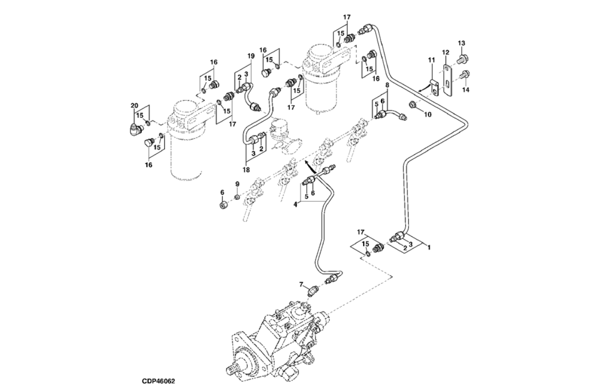 Item Part Number Description Quantity Variation 6356 1 GM50677 Fuel line 1 2 GM17494 Sealing washer 6 3 GM21453 Nut 6 4 GM17549 Fuel line 1 5 223476 Packing 2 6 360141 Nut 4 7 223837 Elbow fitting 1 8 352126 Line, leakoff 1 9 223710 Plug 1 10 # Flange nut, M8 1 11 336749 Clamp 1 12 223492 Strap 1 13 # Screw, M10 x 16 1 14 # Screw, M8 x 16 1 15 360178 O-ring 8 16 360015 Plug 4 17 360037 Fitting 3 18 GM32830 Line, fuel 1 19 GM50675 Fuel line 1 20 GM50676 Elbow fitting, M12 x 1.5 x 1/2 in.-20 UNF 1 # Common hardware; procure locally